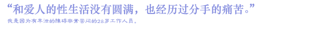 坦率地说,年轻时很少有性生活的机会,所以早泄对我的性生活没有很大的障碍。但是开始上班受到很多压力,和爱人的性生活也不圆满并经历了分手的痛苦。自己很努力,但没有用决定上医院看。给人家还不好意思问我通过因特网检索了有关医院,在许多医院中找到了First泌尿科。虽然是电话咨询但是既亲切又容易理解地解释我,很满意。预约后访问医院并咨询商谈后,才明白了早泄也有“心因性早泄”和“体质性早泄”两种情况还能简单的手术来解决这些问题,所以预定了手术时间。