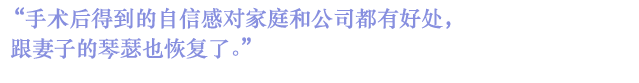 向院长先生咨询,因有早泄而引起的阳痿,下定了做手术的决心。结果非常吃惊。恢复了和妻子的琴瑟,产生生活意欲,冒出以前闪闪的主意力,工作问题也慢慢解决了。像家和万事成这句话,不幸一下子来,但幸运也一下子来了。过了危机的公司重新站在成长的轨道上。