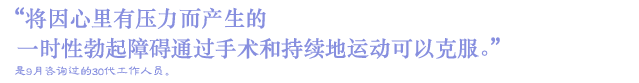 前几个月之前看到很性感的照片就很容易勃起的体质,但是现在看到很性感的录像也没有兴趣也不好勃起,不知道为什么性欲下降得如此快。我想可能是公司问题苦闷而受到很多压力的原因,但早上起来看像以前那样勃起很正常。因此为了商谈去医院了。