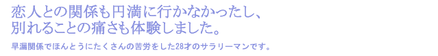 けれども職場の生活をしながらかなりのストレスを受けるようになって、恋人との性的な関係も?満ではなかったし、別れることの痛さまで体験しました。