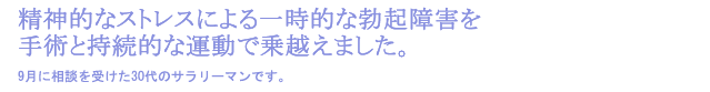 ?長は診?後に朝勃起がよく出来ることを見て正常状態だと言い、心理的な ストレスでよる一時的に勃起に問題が起ることがあると診断を下しました。