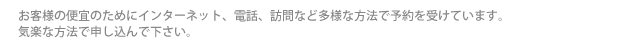 決まった時間以外の?約はイン??ネット?約で可?で、イン??ネット?約は夜間時間及び日曜日、祭日にも便利に利用なさることが出来ます。 イン??ネット?約で?し込んでくだされば翌日担い手が?約状況を電話で知らせて上げます。 イン??ネット?約時、連絡可?な電話番号を必ず書いてくださって、電話の連結が繋がらない御方は?約時メモを残して下さい。